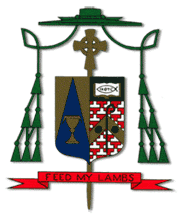 For his motto, Bishop Weigand has chosen, “Feed My Lambs,” echoing the instruction of Jesus to Peter (John 21:15). Since the ministry of Bishop Weigand has been directed especially among the poor, and the Gospel shows the predilection of Jesus for the poor, two empty plates are placed on the chevron of the design.