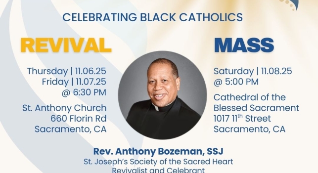 You're invited to attend and participate in the Jubilee Day for Black Catholic Ministry in the Diocese of Sacramento.  The mass will be held on Saturday, November 8 at 5pm at the Cathedral of the Blessed Sacrament.  A Revival event featuring Fr. Anthony Bozeman, SSJ will be held on Thursday & Friday, November 6 & 7 @ 6:30pm.  Hope to see you there.