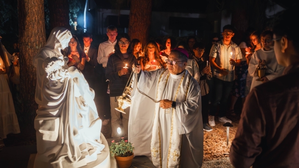 At the Newman Center, Bishop Rey dedicated the newly renovated grounds, which now feature a Rosary Prayer Garden, a replica of Michelangelo’s Pietà, and a nine-foot “Star of the Sea” statue of Mary anchoring the new outdoor quad. The evening concluded with a ribbon-cutting ceremony, followed by a community meal and fellowship among the more than 200 attendees.